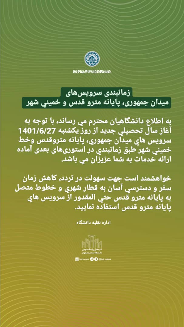 به اطلاع دانشگاهيان محترم مي رساند، با توجه به آغاز سال تحصيلي جديد از روز يكشنبه 1401/6/27 سرويس هاي ميدان جمهوري، پايانه متروقدس وخط خميني شهر طبق زمانبندي فايل هاي پيوست آماده ارائه خدمات به شما عزيزان مي باشد.