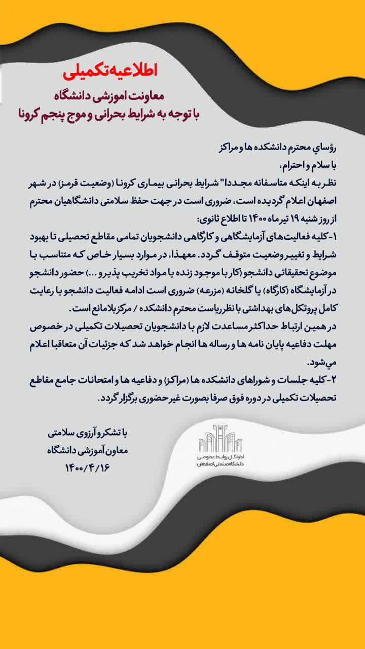 نظر به اين كه متأسفانه مجددا' شرايط بحراني بيماري كرونا (وضعيت قرمز) در شهر اصفهان اعلام گرديده است، ضروري است در جهت حفظ سلامتي دانشگاهيان محترم از روز شنبه 19 تير ماه 1400 تا اطلاع ثانوي:
