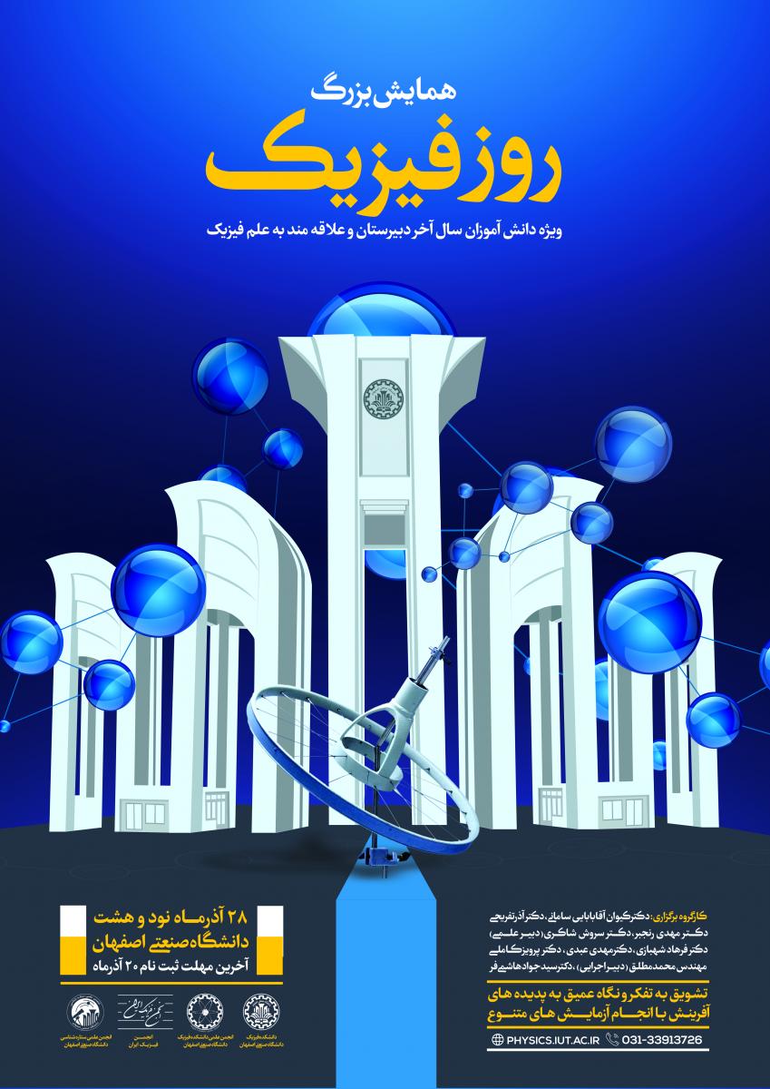دانشکده فیزیک و دفتر استعدادهای درخشان دانشگاه صنعتی اصفهان با همکاری انجمن فیزیک ایران، برای افزایش آگاهی و عمق نگاه علمی دانش آموزان مستعد سال آخر دبیرستان (و یا سال یازدهم ) و آشنا نمودن ایشان با فضای مناسب علمی آموزشی دانشگاه، اقدام به برگزاری همایش بزرگ روز فیزیک در روز پنج شنبه 28آذرماه 1398 نموده است. برنامه برای دو گروه پسران و دختران به صورت جداگانه و مشابه برگزار میگردد که محتوای آن در دو بخش سخنرانیهای مفید و جذاب متناسب با دانش آموزان شرکت کننده و انجام آزمایش های عملی در زمینه های ترمودینامیک، اپتیک، فیزیک جدید، مکانیک، الکترومغناطیس و ... میباشد.