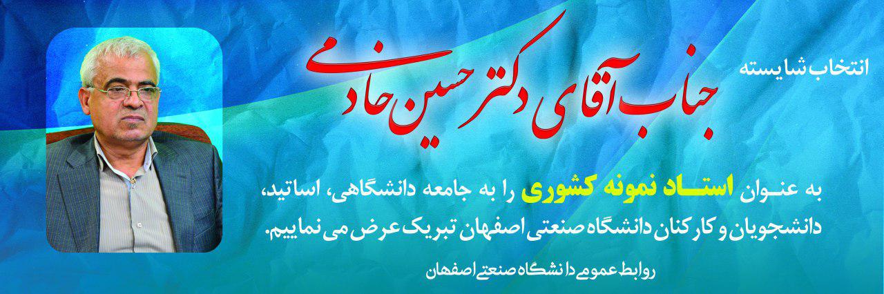 در بیست و ششمین آیین نکوداشت اساتید نمونه کشور که صبح امروز و با حضور دکتر منصور غلامی وزیر علوم، تحقیقات و فناوری به میزبانی دانشگاه علامه طباطبایی برگزار شد، دکترحسین خادمی موغاری، استاد گروه خاکشناسی دانشکده کشاورزی دانشگاه صنعتی اصفهان بعنوان یکی از 10 استاد نمونه کشور مورد تجلیل قرار گرفت.