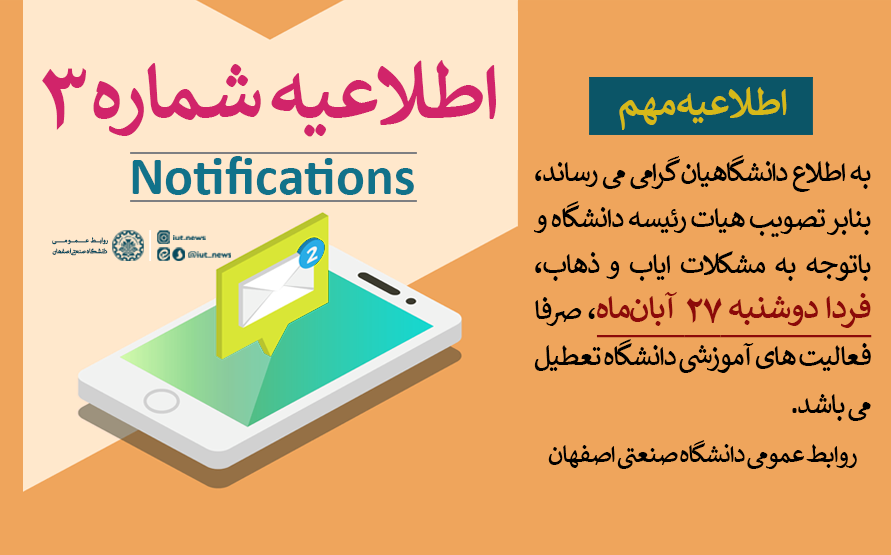بر اساس تصمیم هیات رئیسه دانشگاه صنعتي اصفهان و با توجه به مشكلات اياب و ذهاب دانشگاهيان گرامي، صرفا فعاليتهاي آموزشي دانشگاه صنعتي اصفهان در روز دوشنبه 27 آبان ماه تعطيل خواهد بود.