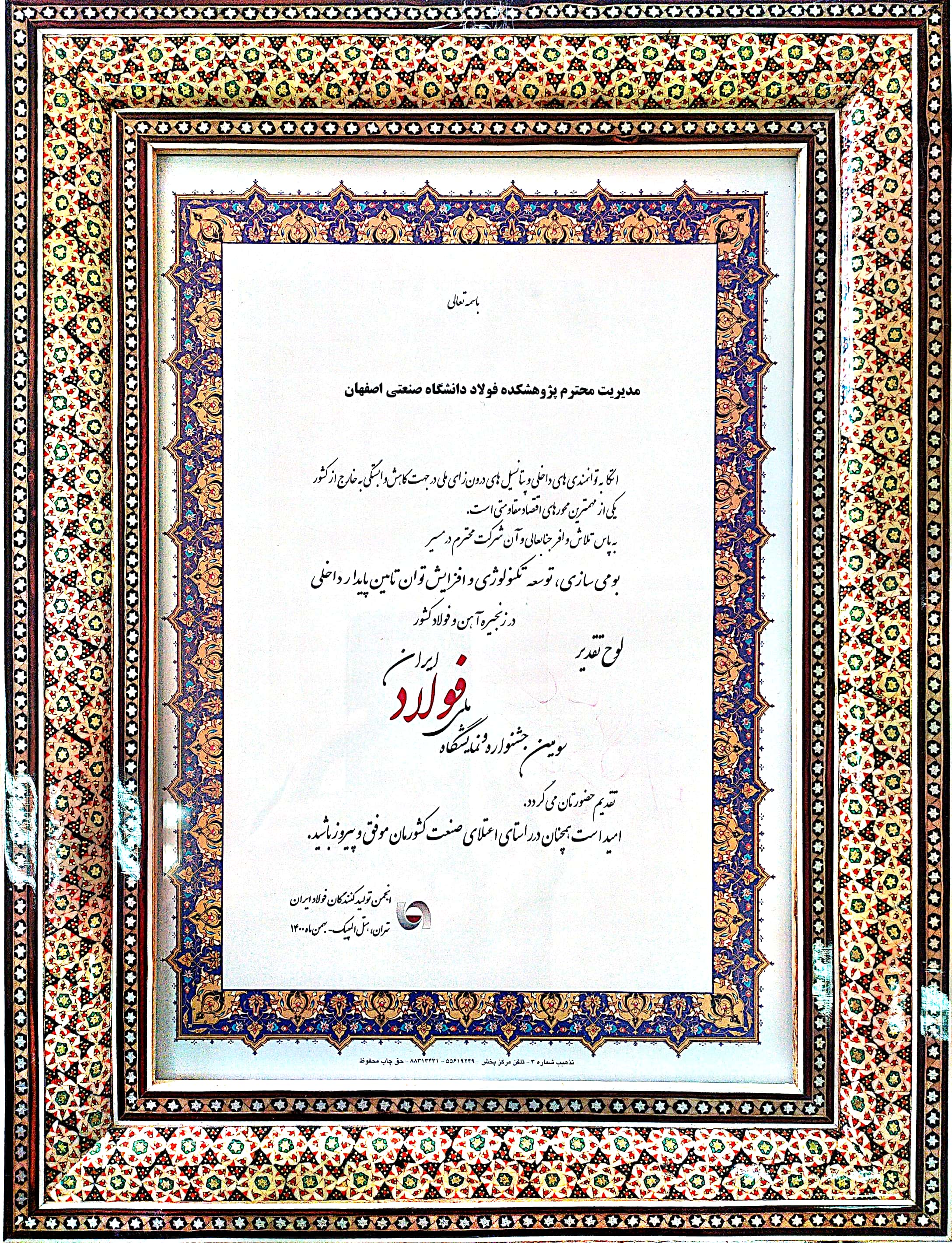 سومین جشنواره و نمایشگاه ملی فولاد ایران توسط انجمن تولید کنندگان فولاد ایران ، از تاریخ 19 تا 21 بهمن ماه در هتل المپیک تهران برگزار و پژوهشکده فولاد دانشگاه صنعتی اصفهان موفق به دريافت عنوان تأمین کننده برتر شرکت فولادمبارکه در حوزه تحقیق و توسعه و تکنولوژی شد.