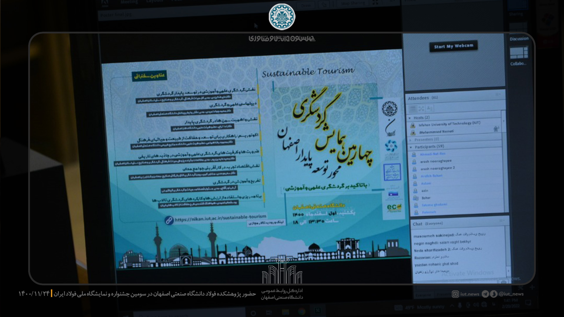 چهارمین همایش گردشگری با محور توسعه پایدار اصفهان و با تاکید بر گردشگری علمی و آموزشی عصرروز یکشنبه ۱ اسفندماه بهصورت حضوری و برخط در دانشگاه صنعتی اصفهان برگزار شد.