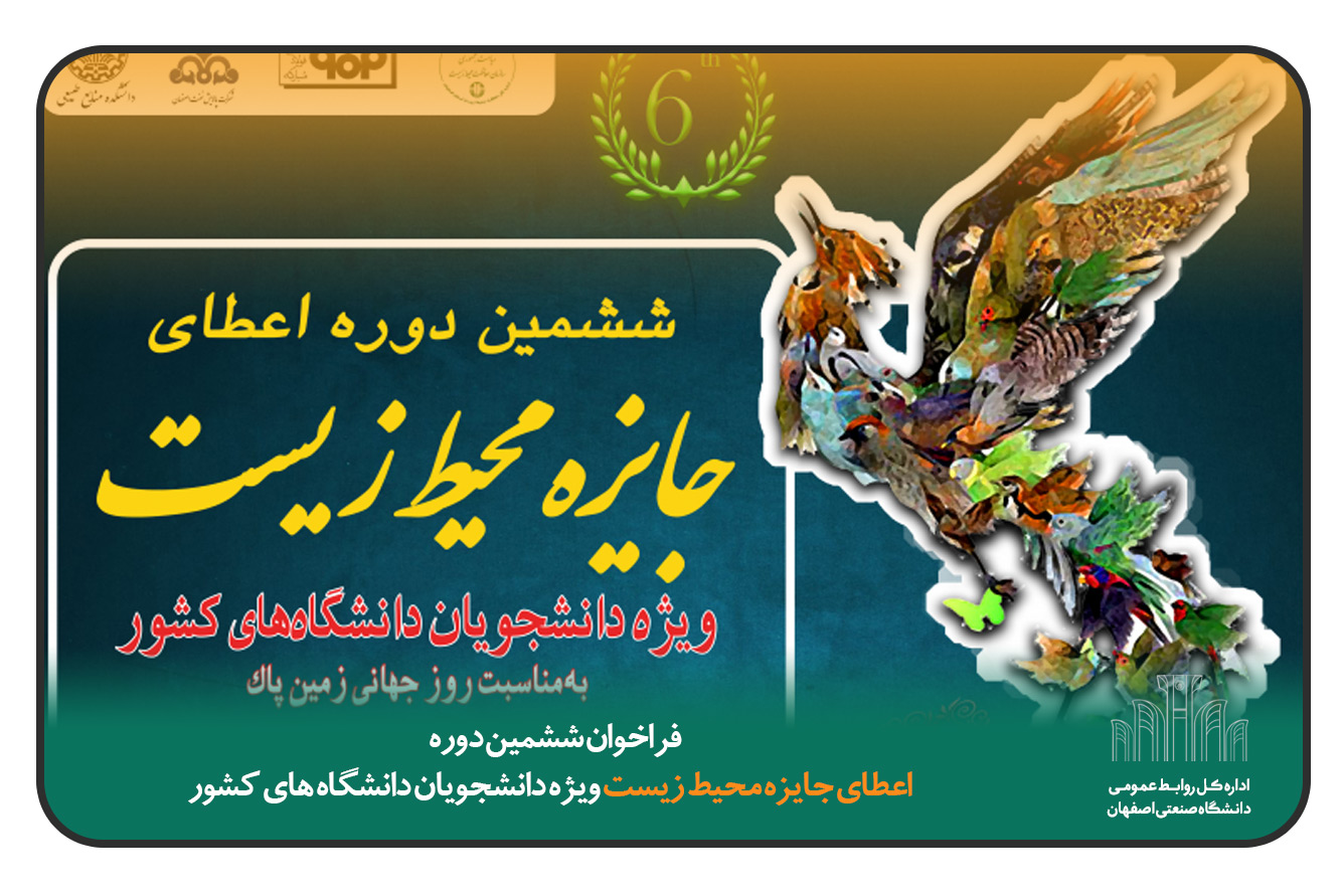 ششمين دوره اعطاي جايزه محيط زيست ويژه دانشجويان دانشگاه هاي كشور با تقدير از تلاش هاي علمي – پژوهشي دانشجويان كشور در عرصه محيط زيست، همزمان با روز جهاني زمين پاك –19 ارديبهشت -1401 به ميزباني دانشگاه صنعتي اصفهان برگزار مي شود.