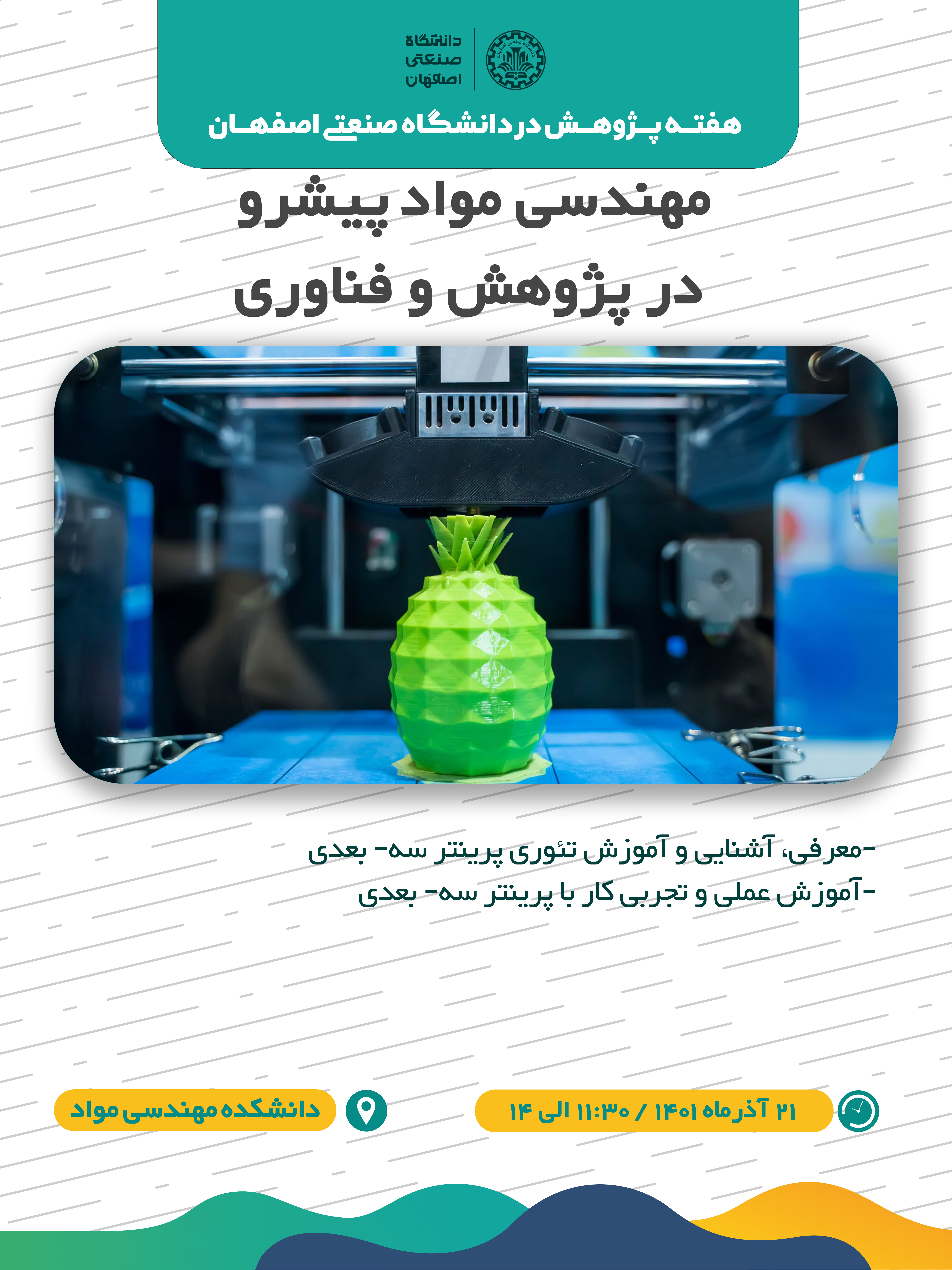 11:30 الی 14آموزش عملی و تجربی کار با پرینتر سه- بعدی ارائه نیازهای فناورانه شرکت سهامی ذوب آهن 22 آذرماه 1401