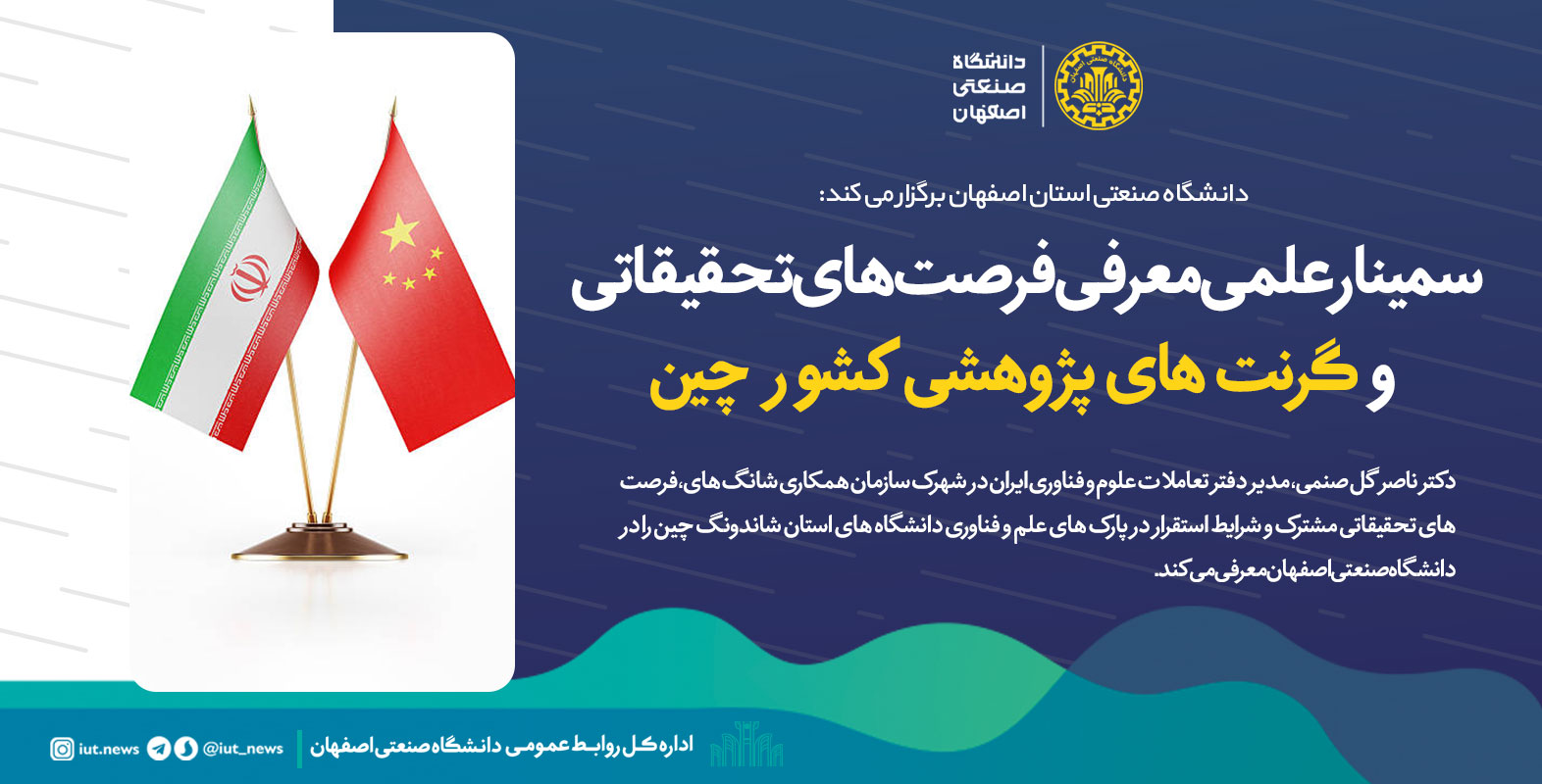 مرکز همکاری های علمی و بین المللی دانشگاه صنعتی اصفهان، سمینار علمی معرفی فرصت های تحقیقاتی و گرنت های پژوهشی کشور چین را، روزیکشنبه 16 بهمن ماه در تالار شهید فتوحی دانشگاه صنعتی اصفهان، برگزار می کند.