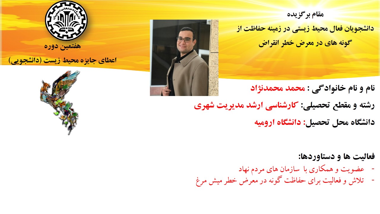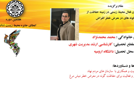 همچنن از تلاش محمد محمدنژاد، دانشجوی کارشناسی ارشد مدیریت شهری از دانشگاه ارومیه برای  حفاظت از گونه های در معرض خطر انقراض مانند میش‌مرغ، پرنده‌ای که در فهرست سرخ اتحادیه بین‌المللی حفاظت از طبیعت قرار دارد ، در بخش دانشجویان فعال محیط زیستی در زمینه حفاظت از گونه های در معرض خطر انقراض ، تقدیر به عمل آمد.