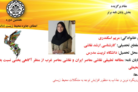 مقام برگزیده بخش پایان نامه برتر، به دانشجوی رشته کارشناسی ارشد نقاشی دانشگاه تربیت مدرس اهدا شد که توانسته است با ارایه پایان نامه مطالعه تطبیقی نقاشی معاصر ایران و نقاشی معاصر غرب از منظر آگاهی بخشی نسبت به مسائل زیست محيط ؛ رویکردی نوین و جذاب به منظور افزایش توجه به مشکلات محیط زیستی در حوزه هنر داشته باشد.
