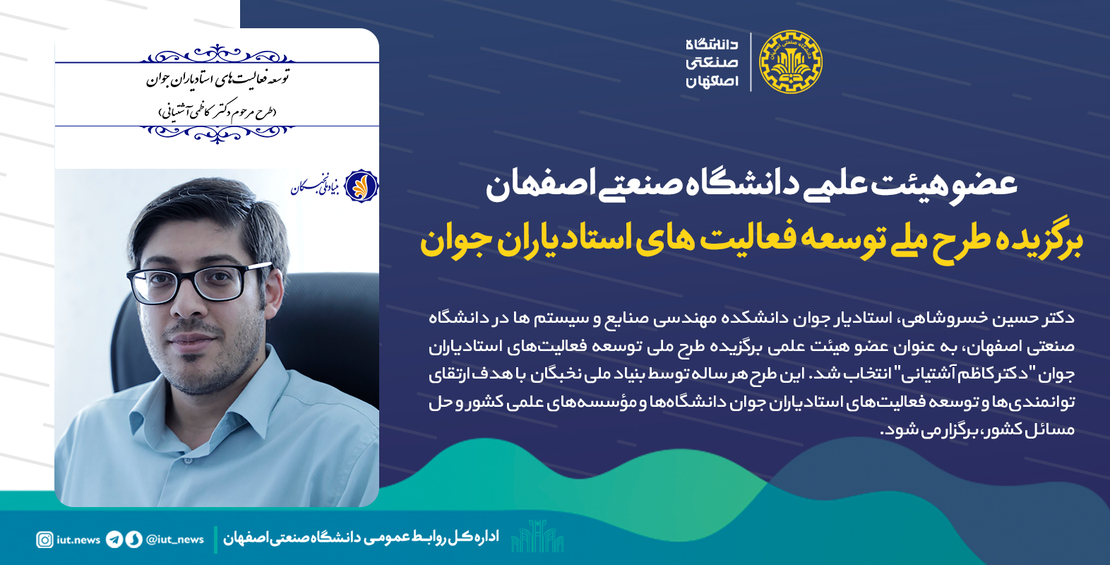 دکتر حسین خسروشاهی، استادیار جوان دانشکده مهندسی صنایع و سیستم ها در دانشگاه صنعتی اصفهان، به عنوان عضو هیئت علمی برگزیده طرح ملی توسعه فعالیتهای استادیاران جوان 'دکتر کاظم آشتیانی' انتخاب شد.