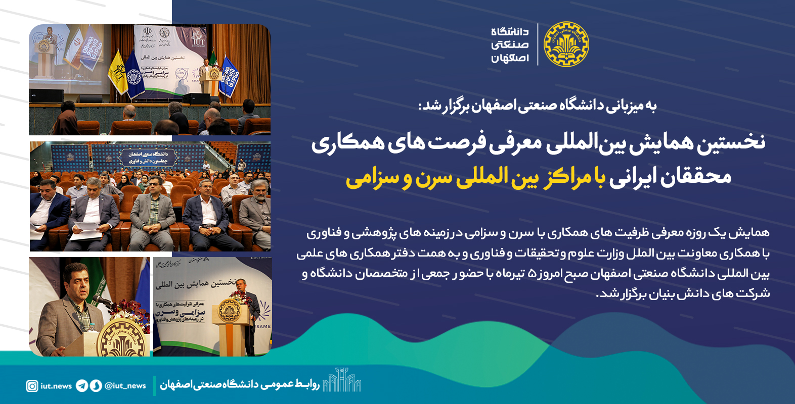 همایش یک روزه معرفی ظرفیتهای همکاری با سرن و سزامی در زمینههای پژوهشی و فناوری با همکاری معاونت بین الملل وزارت علوم و تحقیقات و فناوری و به همت مدیریت امور بین الملل دانشگاه صنعتی اصفهان 5 تیرماه با حضور جمعی از متخصصان دانشگاه و شرکتهای دانش بنیان برگزار شد.