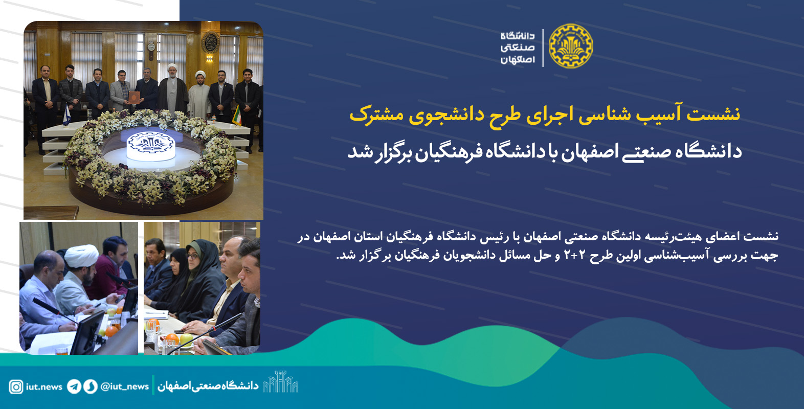 نشست اعضای هیئترئیسه دانشگاه صنعتی اصفهان با رئیس دانشگاه فرهنگیان استان اصفهان در جهت بررسی آسیبشناسی اولین طرح ۲+۲ و حل مسائل دانشجویان فرهنگیان برگزار شد.