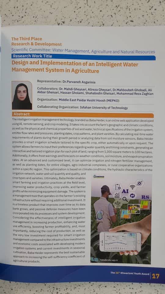 این شرکت با مدیریت دکتر مهدی قیصری، عضو هیئتعلمی دانشگاه صنعتی اصفهان، موفق شد با مشارکت ۲۵ درصدی، رتبه سوم بخش طرحهای توسعهای را در این جشنواره کسب کند. دکتر پروانه عسگری نیا، پژوهشگر و مدیرعامل این شرکت، لوح تندیس و جایزه جشنواره بینالمللی خوارزمی را از دستان دکتر مسعود پزشکیان، رئیسجمهور، دریافت کرد.گفتنی است «این سامانه با هدف بهینهسازی مصرف آب در بخش کشاورزی و استفاده از فناوریهای نوین طراحی شده است و میتواند نقش مؤثری در مدیریت پایدار منابع آبی کشور ایفا کند.» جشنواره بینالمللی خوارزمی به عنوان یکی از معتبرترین رویدادهای علمی کشور، هر ساله با هدف شناسایی و تقدیر از پژوهشگران، مخترعان و فناوران برتر در حوزههای مختلف علمی برگزار میشود.