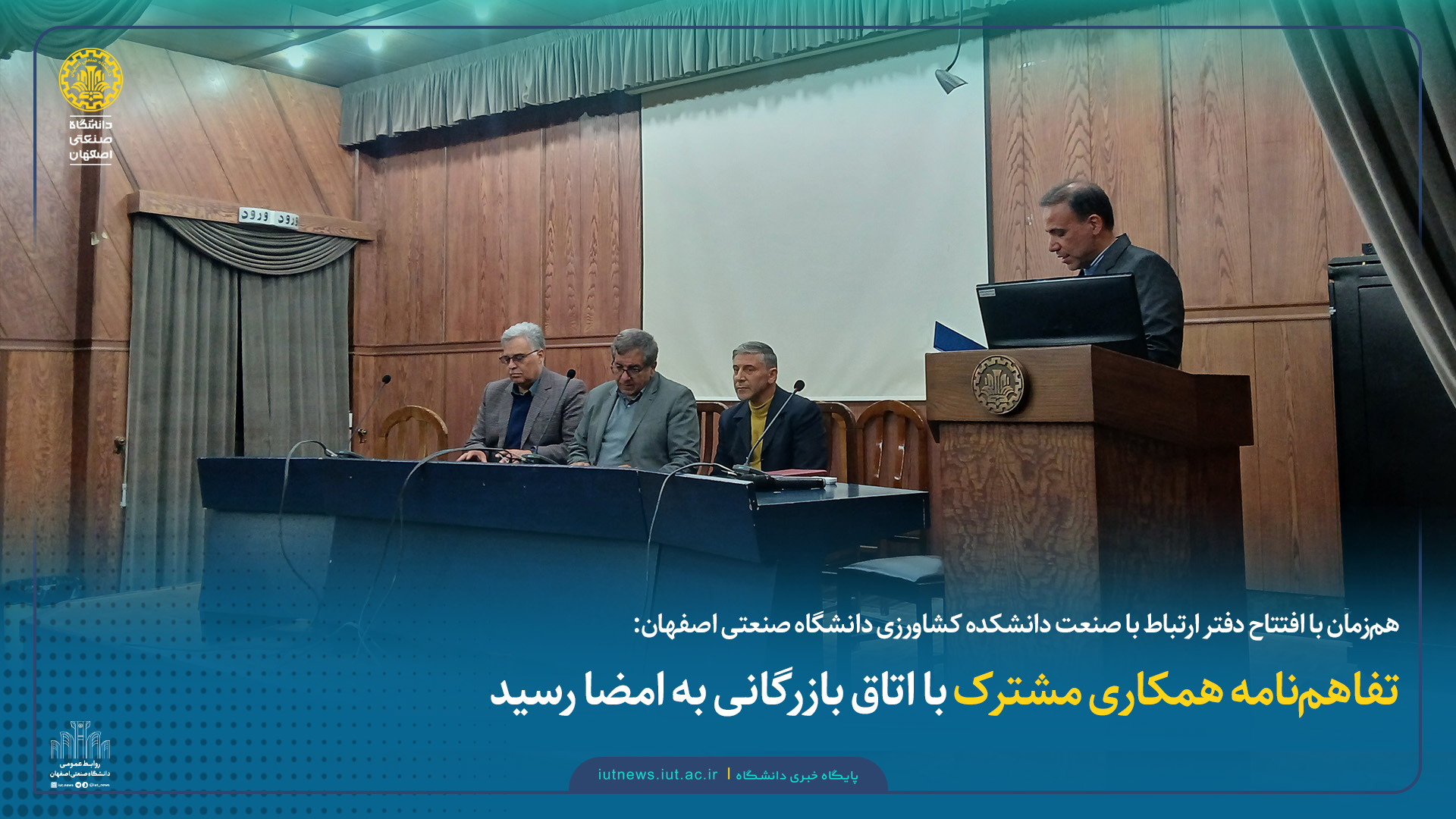 در مراسم افتتاح دفتر ارتباط با صنعت دانشکده کشاورزی دانشگاه صنعتی اصفهان، تفاهمنامهای بین کمیسیون کشاورزی و صنایع تبدیلی اتاق بازرگانی، صنایع، معادن و کشاورزی اصفهان و دانشگاه صنعتی اصفهان امضا شد.