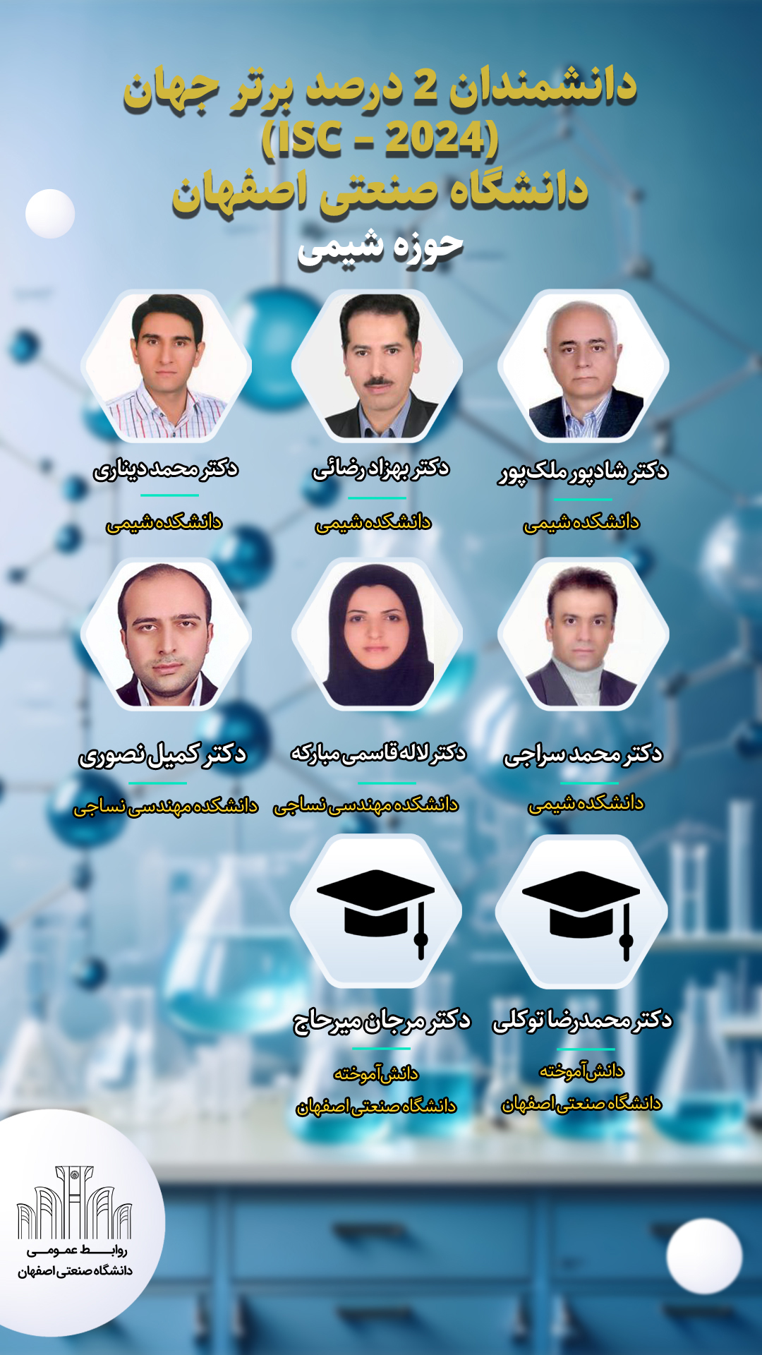 در حوزه موضوعی شیمی، دکتر شادپور ملک پور، دکتر بهزاد رضائی، دکتر محمد دیناری، دکتر محمد سراجی از اعضای هیأت علمی دانشکده شیمی، دکتر لاله قاسمی مبارکه و دکتر کمیل نصوری از اعضای هیأت علمی دانشکده مهندسی نساجی، دکتر محمدرضا توکلی و دکتر مرجان ميرحاج از دانش آموخته گان دانشگاه صنعتی اصفهان دیگر پژوهشگران 2 درصد برتر جهان اعلامی از سوی isc هستند.