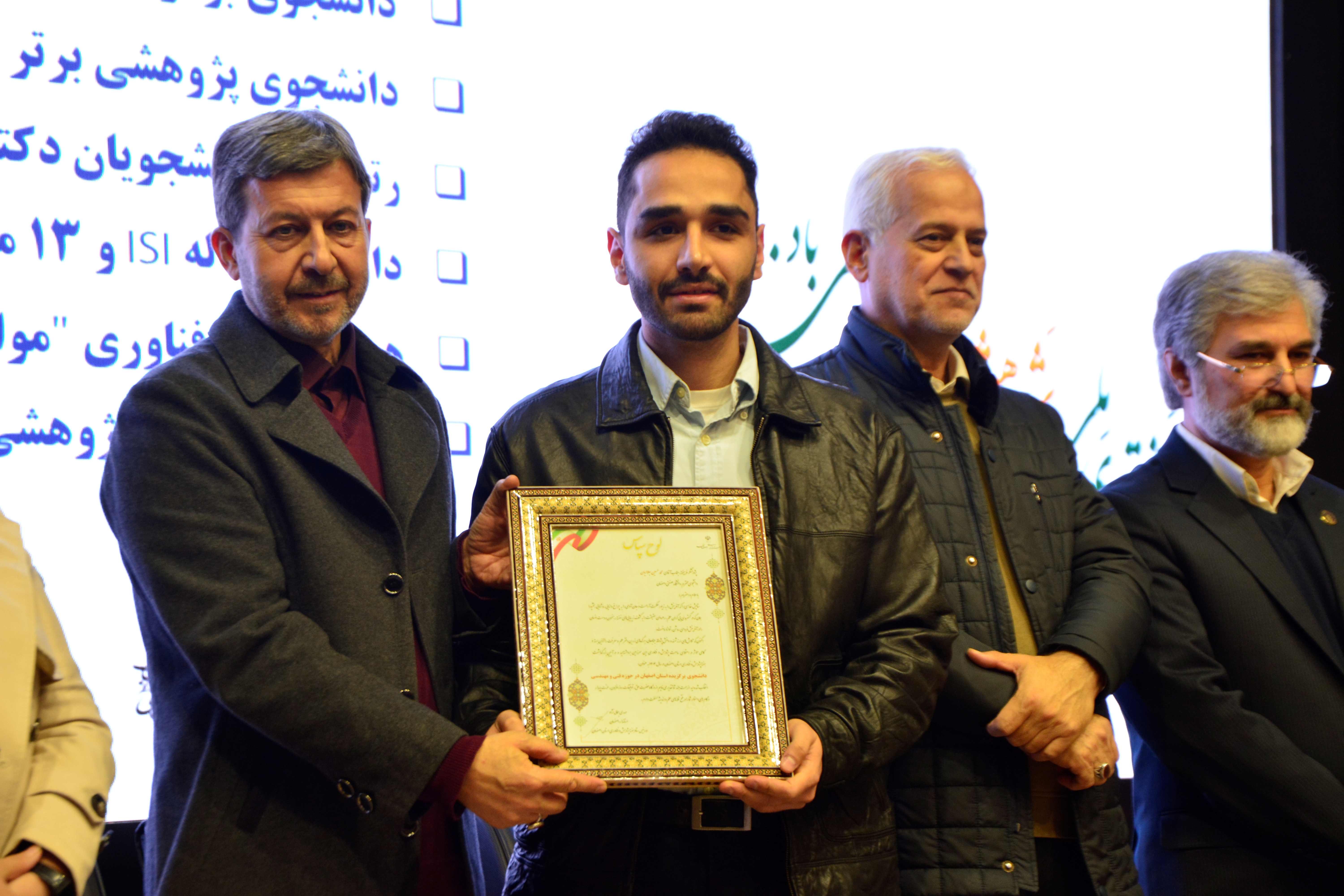 همچنین در بخش دانشجویی، سه دانشجوی پژوهشگر دانشگاه صنعتی اصفهان موفق به کسب عنوان برگزیده شدند. محمدحسین جلالیان و حمیدرضا قربانی در گروه فنی و مهندسی و محمدمهدی رستمآبادی در گروه کشاورزی و منابع طبیعی، برگزیدگان این بخش بودند.